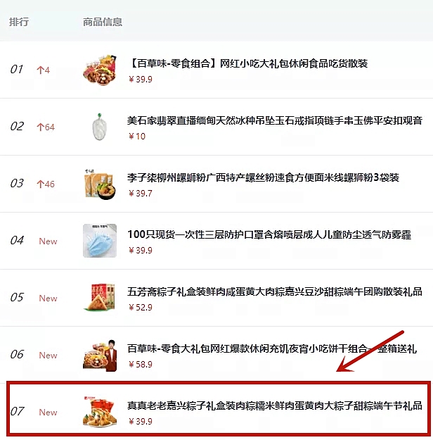 知瓜数据5月爆款商品榜,真真老老粽子礼盒排名第7 | 图源:知瓜数据