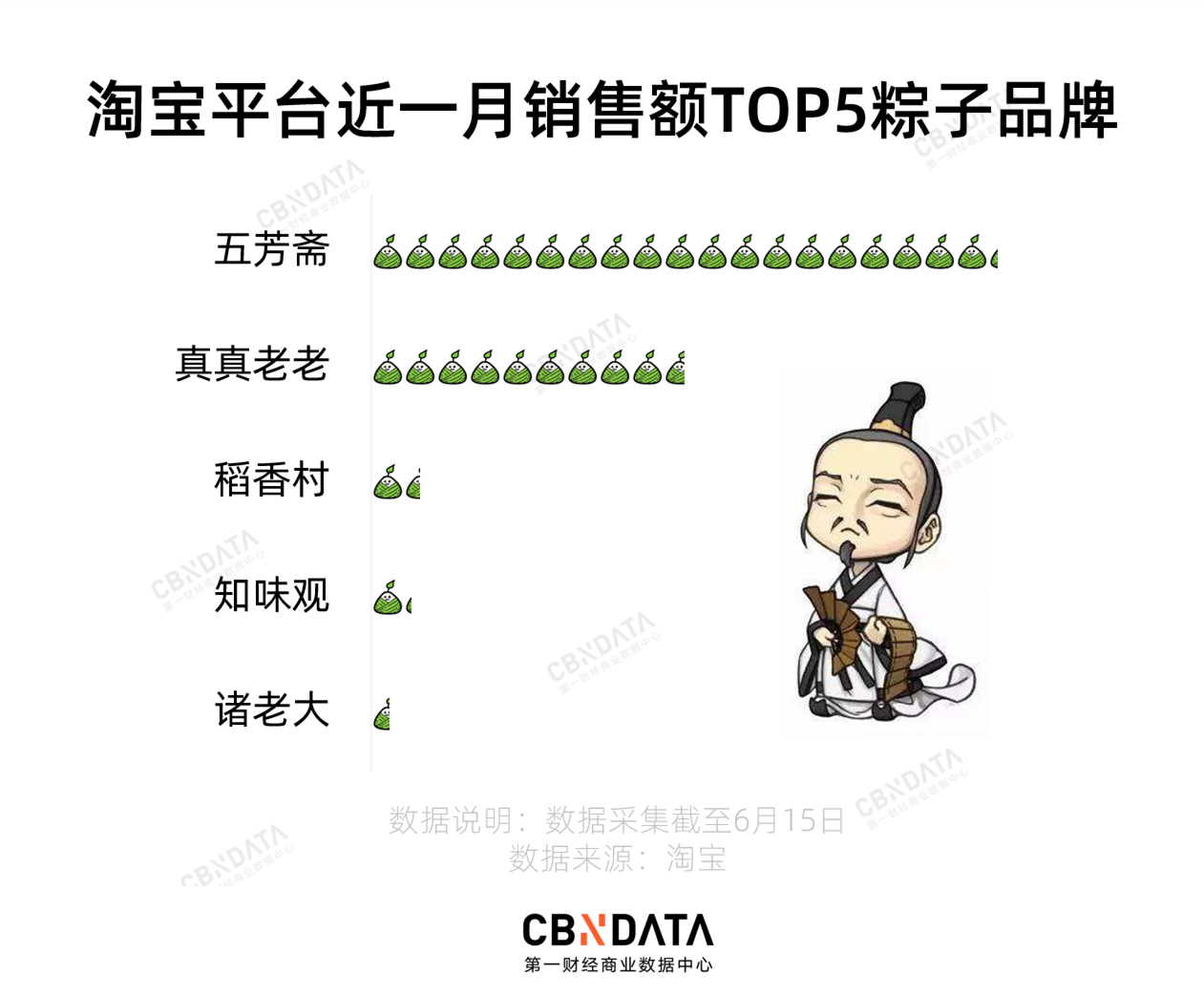 CBNData根据淘宝前端数据粗略一算,在截至6月15日的一个月里,淘宝平台已经卖出了价值2个多亿的粽子!其中月销售额排名前五的品牌,个个是拥有百年历史的老字号。任你星巴克们百般玩花样博眼球,正经做起粽子来,“姜还是老的辣”!