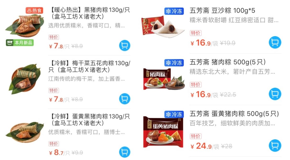 和肉禽类产品一样,粽子也按保存方式的不同分为常温、冷冻和冷鲜三种:礼盒装的真空粽子能在常温下保存9个月;冷冻粽子的保质期则可长达12-18个月;而目前盒马在售的诸老大冷鲜粽,保质期只有短短4天。对存储、物流要求更高,在消费者心目中也“更新鲜”的“短保”冷鲜粽,也对应更高的价位。