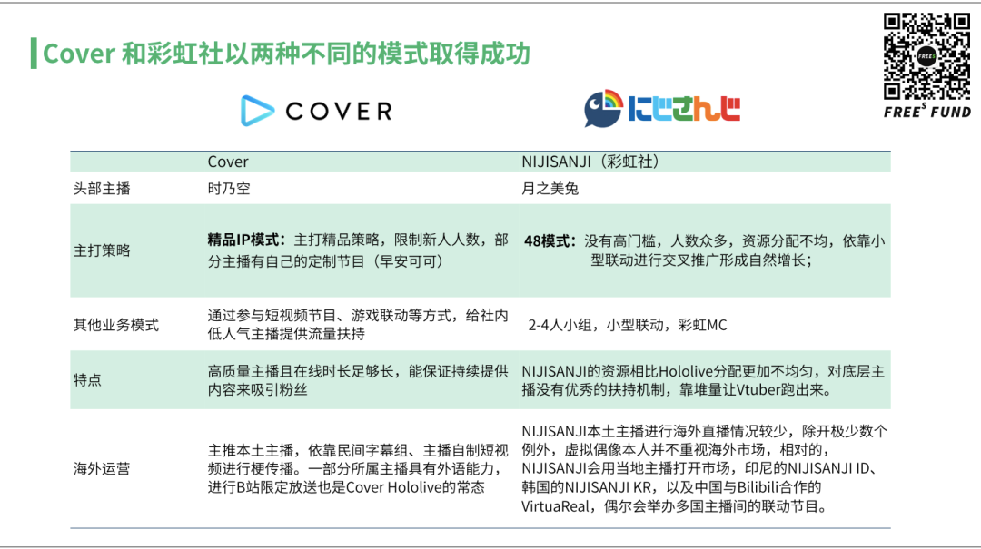 给大家介绍一下最头部的两家:COVER 和彩虹社。这两家在中国都有业务,都是做 Vtuber 为主,但是模式有显著不同。COVER 走的是偏精品 IP 的路线,每个推出的 Vtuber,一定是精心策划好了,能保证质量。