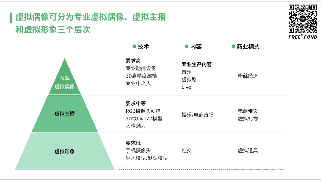 最顶层,继初音未来和洛天依为代表的初代顶级虚拟偶像之后,第二代虚拟偶像引入更多技术。它们采用的技术包括动作捕捉、3D建模。这些技术一定是行业最顶级的,因为它的核心就是要提供给用户最好的视听体验。除了技术要求高之外,背后的中之人(虚拟偶像背后的声优)、围绕虚拟偶像打造的衍生内容:音乐、虚拟剧、LIVE 演出等等,都必须用最好的技术打造。最终虚拟偶像的商业模式也接近传统偶像相关的商业模式,需要通过粉丝经济变现。