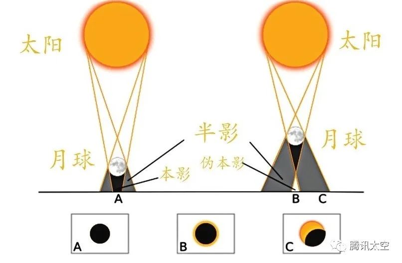 图注:日全食、日偏食和日环食形成的原理示意图。