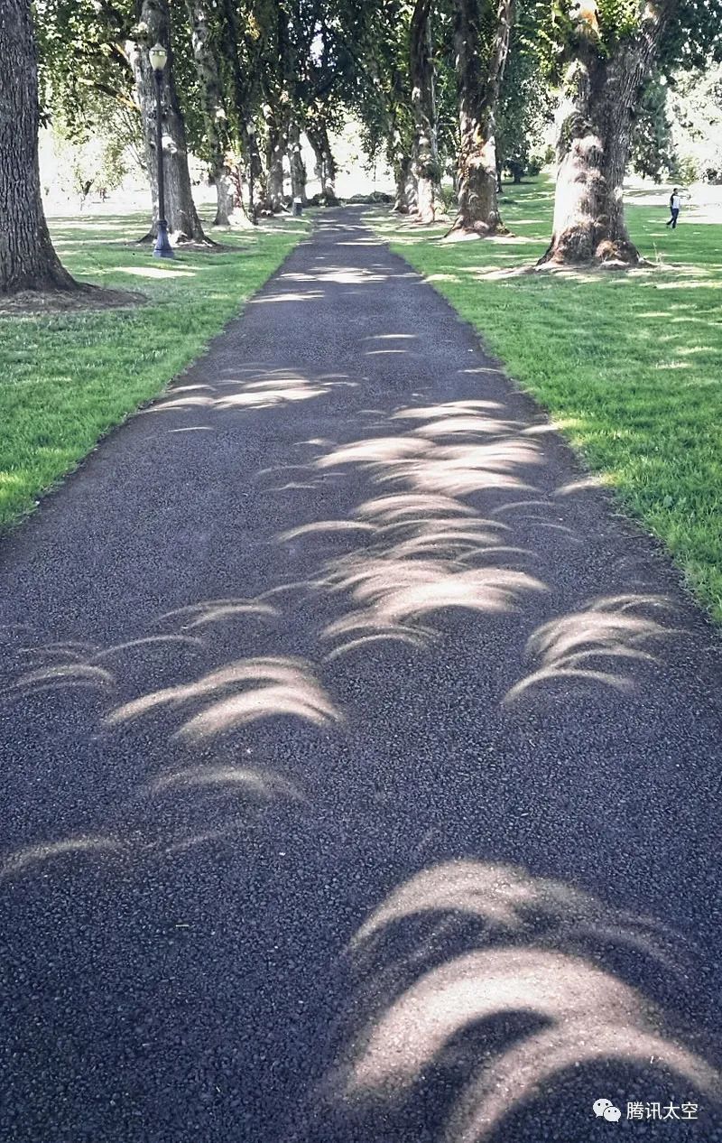 图注:树叶的缝隙形成一个个小孔,在地面上投下日偏食的像。