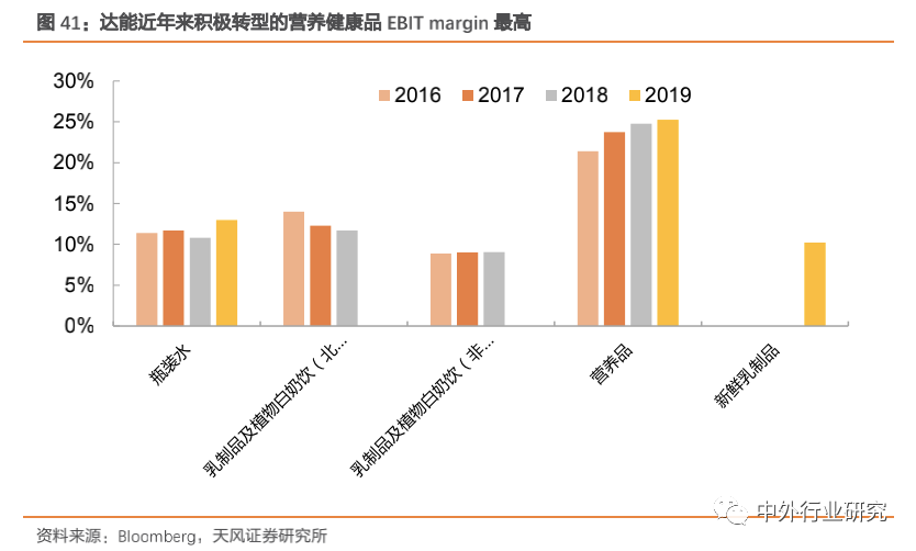 达能2007 年以来定位健康食品公司,加大向健康营养产品资源倾斜,营养品在集团业务中 EBIT margin 最高。