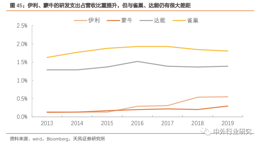 伊利蒙牛加大研发投入。2019 年伊利、蒙牛研发投入占营业收入的比重仅为0.55%、0.30%,仍处于较低水平。