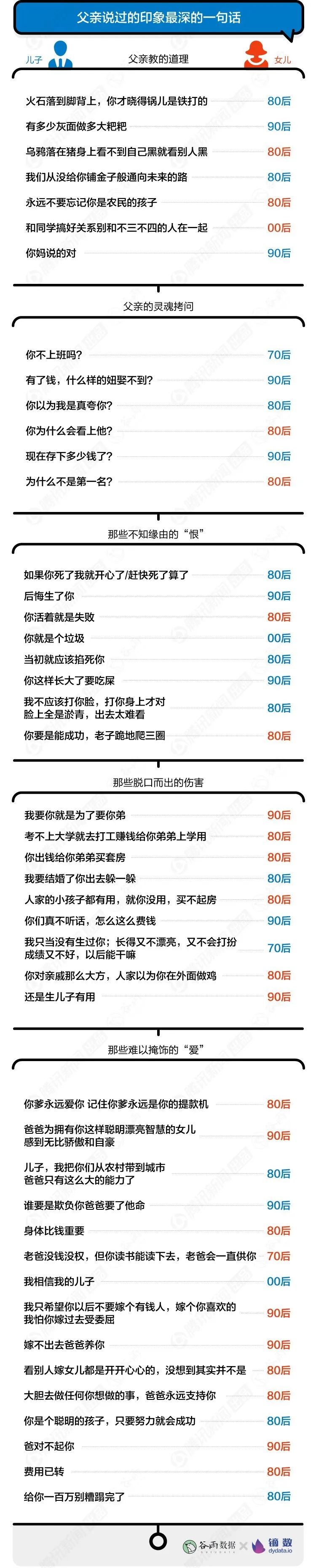 问卷的最后有这样一个问题:“你印象最深的一句父亲的话是什么?”在一万多条网友的回答中,被父亲说“爱你”出现了61次,被父亲说“滚”出现了59次。