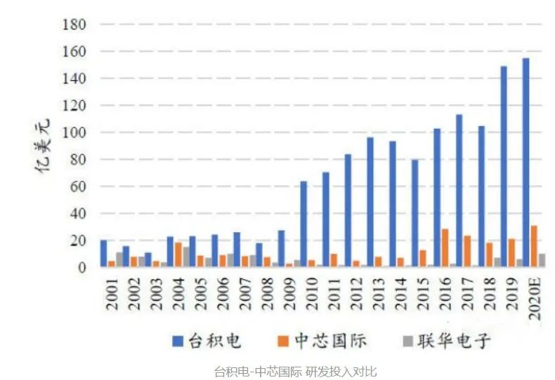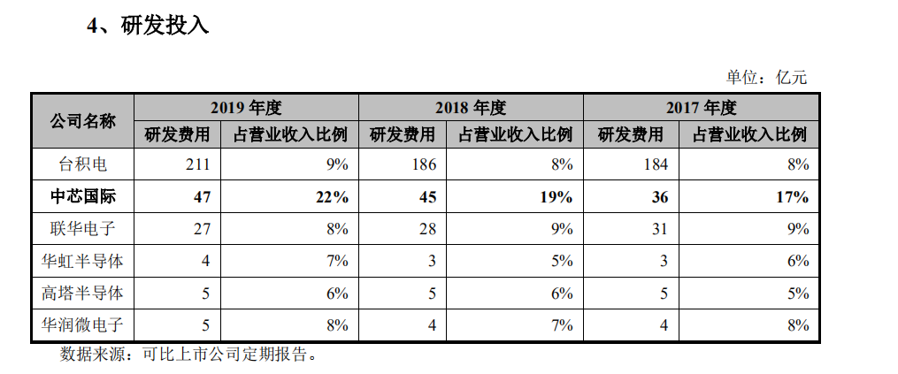 中芯国际招股书显示,近三年来研发投入始终维持在20%,在其他主流代工厂商均低于10%的情况下已经极为可贵;相比之下,台积电研发投入一直不到10%,不过每年还是要花掉约200亿元。