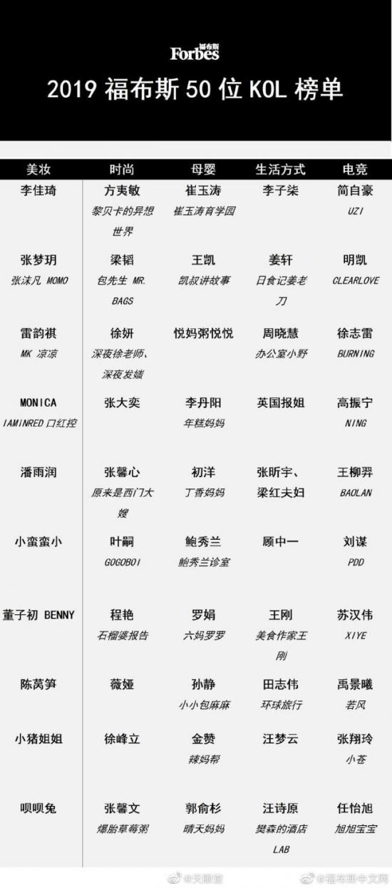 商家自己说还不够,他们还花钱让各个领域有影响力的人推荐、带货。下图中被评选出来的50位KOL,在各自的领域都有骄人的战绩。从美妆到时尚,从母婴到生活,年轻人在社会上成长的轨迹已经被这些KOL们“包圆”了。“种草”“剁手”几乎填满了年轻人的业余生活。