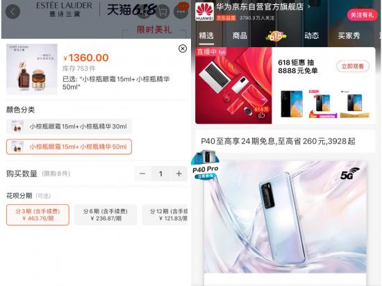 最近正值618大促,“螳螂财经”打开了淘宝和京东,这两大平台自带的网贷平台推出了各种分期方案。比如淘宝的“雅诗兰黛小棕瓶”(下图左),在加购物车时就能够轻松选择各种“花呗”分期方案。而在京东的华为手机官方旗舰店中(下图右),京东金融的“24期免息”成为了最显眼的宣传语。