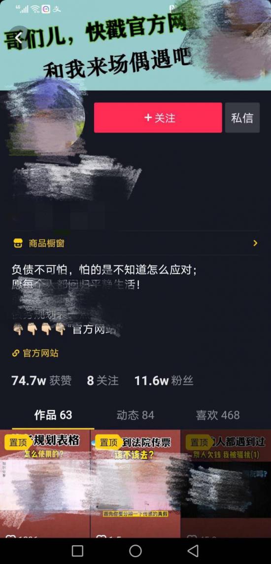 但也有一些年轻人选择和借贷平台斗智斗勇,加入一些自发组织的“反催债组织”。据“螳螂财经”观察,抖音上某个教年轻人们应对催债的账号,半天就涨粉三万。应对策略包括“协商还款怎么谈”“电话应该怎么接”“接到法院传票该不该去”,而一条置顶的视频“申请停息挂账不同意怎么办”获得了19.6万个赞。