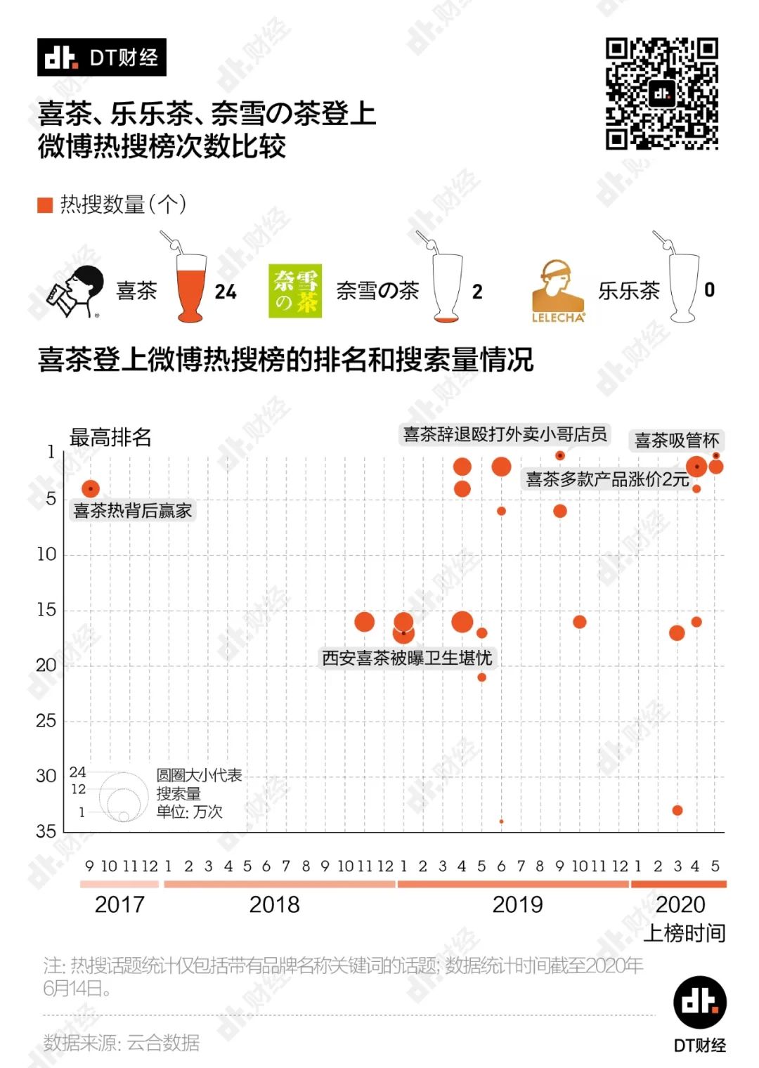 的确,喜茶的营销活动给Ta带来了很高的热度。喜茶从2017年以来总共登上24次热搜榜,其中2019年达到了爆发式的14次,2020年截至目前也已经达到8次。而Ta的对手奈雪仅有2次,乐乐茶则没有姓名。