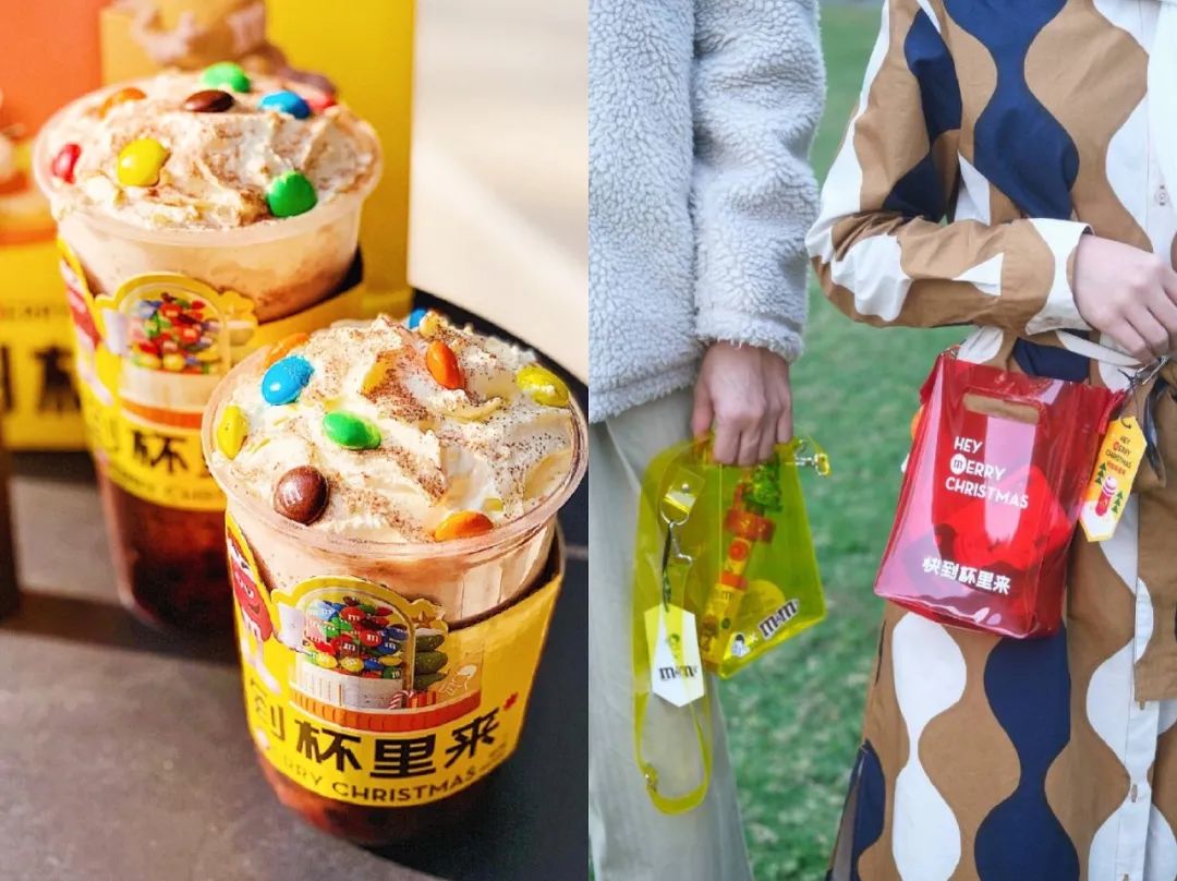 (图片为喜茶与M&M巧克力豆联名饮料及周边)