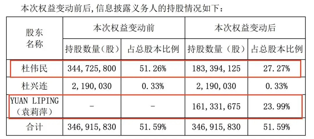 老板和老板娘分手了,但是在利益分配上没有撕扯,老板杜伟民把持有的约1.61亿股公司股份给了老板娘,俩人还签署了《一致行动人与表决权委托协议》。