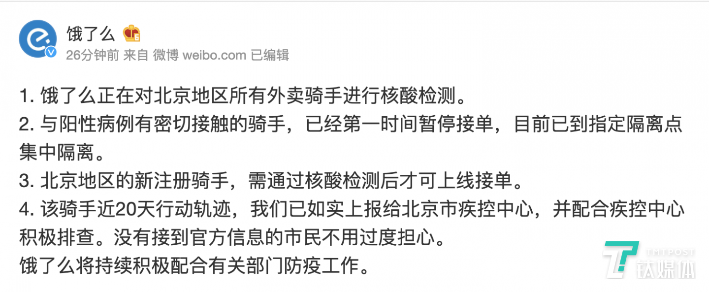 - 饿了么正在对北京地区所有外卖骑手进行核酸检测。