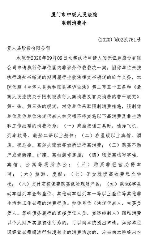 该限制消费令称,本院于2020年9月9日立案执行申请人国元证券股份有限公司申请执行你单位国内非涉外仲裁裁决一案,因贵人鸟未按执行通知书指定的期间履行生效法律文书确定的给付义务,对你单位采取限制消费措施,限制你单位及你单位法定代表人林天福不得实施高消费及非生活和工作必需的消费行为。