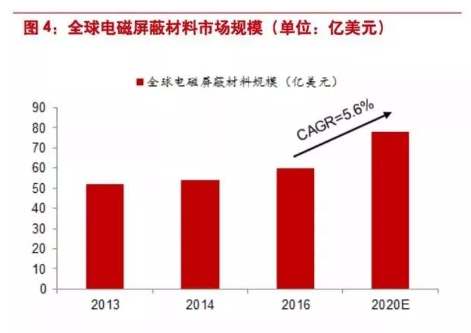 而随着车联网、家联网甚至体联网在5G网络下的逐渐应用,这些常规场景下电磁屏蔽的效率和性能,也将进入增长期。BCCResearch预测,全球EMI/RFI屏蔽材料市场规模将于2021年达78亿美元,界面导热材料将于2020年达11亿美元规模。
