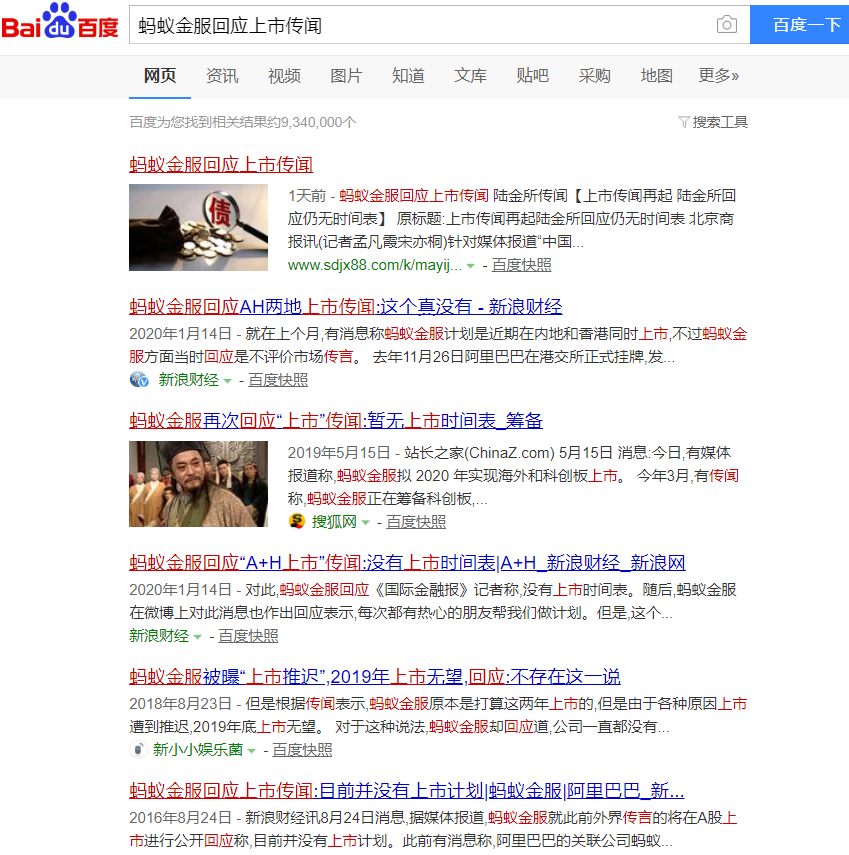 这也不奇怪,毕竟这些年,关于蚂蚁金服上市的传闻便会隔三差五冒出来。百度一下,搜索出来的结果惊人: