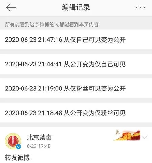 不过,牛萌萌涉毒的“反转”过程则更充满戏剧性。一开始牛萌萌否认染毒,有一些网友认为她可能被冤枉了,就回头说新京报是“无良媒体”。同时,当天“北京禁毒”这个机构账号也转发了新京报的消息,但随后几度修改,在“公开”和“隐藏”之间摇摆不定,也对人们的心态造成了一定影响。