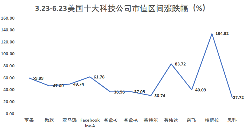 《深网》统计了美国总市值排名前十的科技公司近3个月来市值变化和区间涨幅发现,3月23日-6月23日之间,这十大科技公司市值区间涨幅都在20%以上,其中特斯拉涨幅最大,为134.32%,其总市值从3月23日的797.84亿美元涨到6月23日的1858.06亿美元;思科区间涨幅最小,为27.72%,总市值从3月23日的1467.34亿美元涨到6月23日的1919.88亿美元。