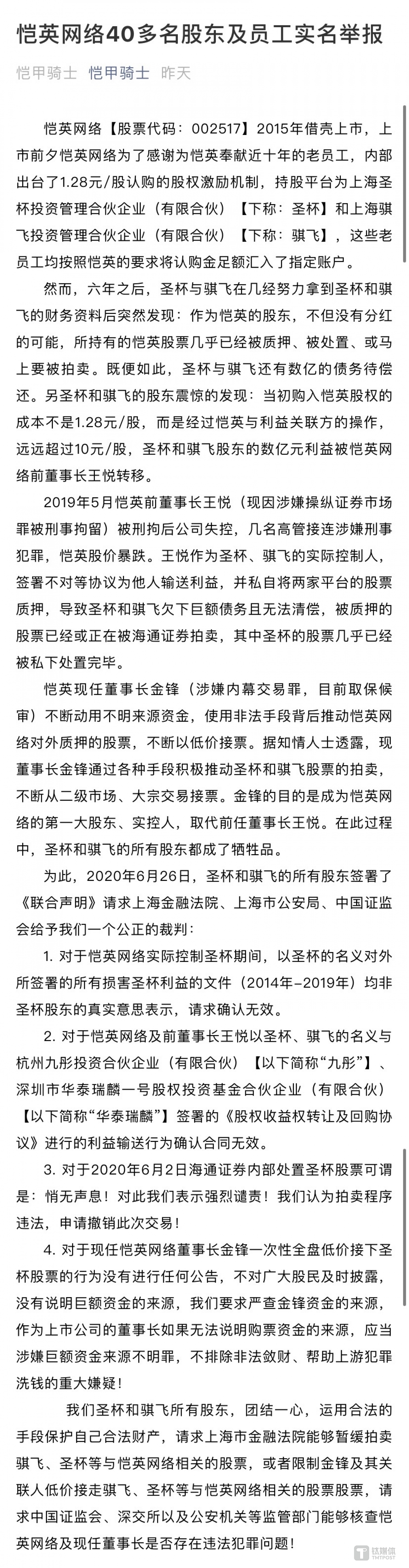 钛媒体注:昨日,微信公众号“恺甲骑士”发布文章《恺英网络40多名股东及员工实名举报》称,恺英通过与利益关联方的操作,使得股东持股平台上海圣杯投资管理合伙企业(下称:圣杯)和上海骐飞投资管理合伙企业(下称:骐飞)的数亿元利益被恺英网络前董事长王悦转移。