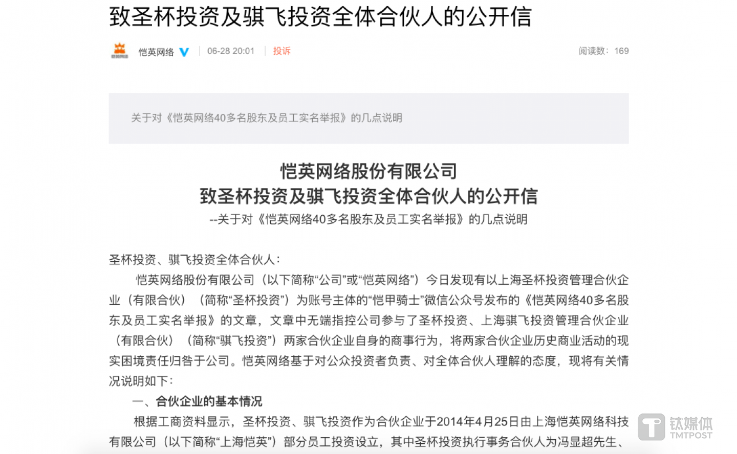 针对上述公开信,6月28日当晚,恺英网络发布了《致圣杯投资及骐飞投资全体合伙人的公开信》,恺英网络表示《举报》中无端指控公司参与了圣杯投资、骐飞投资两家合伙企业自身的商事行为,将两家合伙企业历史商业活动的现实困境责任归咎于公司。