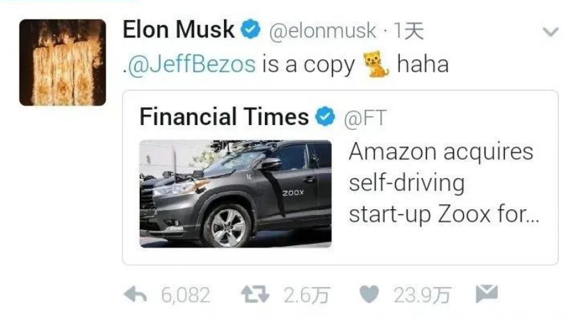 最近,马斯克又抓住一次机会,对着 “老冤家”贝佐斯使用了嘲讽的技能。马斯克在转发一则“亚马逊收购自动驾驶公司Zoox”的新闻里,称这位全球首富是一只“抄袭猫”(copycat)。