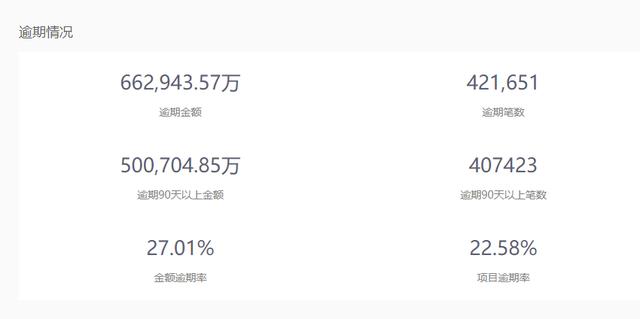 此外,爱钱进目前逾期金额为66.29亿余元,逾期笔数达421651笔。逾期90天以上金额为50.07亿余元,逾期90天以上笔数为407423笔。金额逾期率为27.01%,项目逾期率为22.58%。
