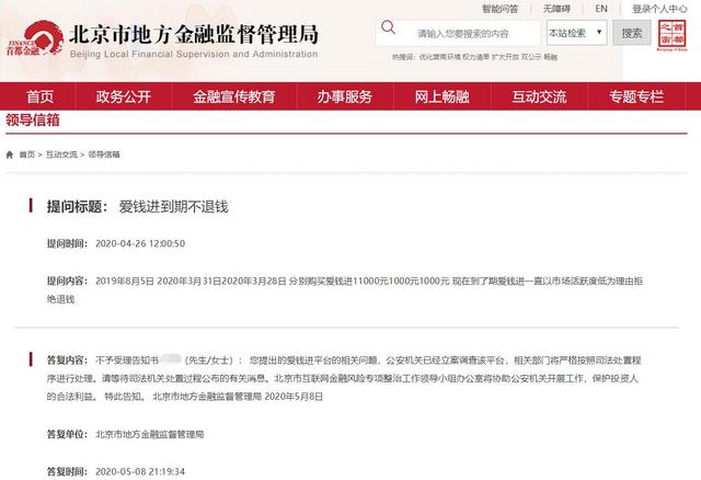 5月8日,北京市地方金融监督管理局答复的“不予受理告知书"内容指出:“您提出的爱钱进平台的相关问题,公安机关已经立案调查该平台,相关部门将严格按照司法处置程序进行处理。请等待司法机关处置过程公布的有关消息。”这也意味着公安机关已经立案调查爱钱进这家平台,并严格按照司法处置程序进行处理。