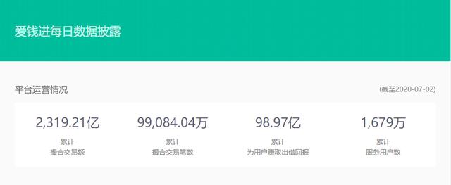 爱钱进运营数据显示,截至2020年7月2日,平台累计撮合交易额2318.97亿元,交易笔数达9.9亿笔,服务用户数高达1679万人。其中,累计借贷金额为1047.5亿元,借贷余额本金227.61亿元。
