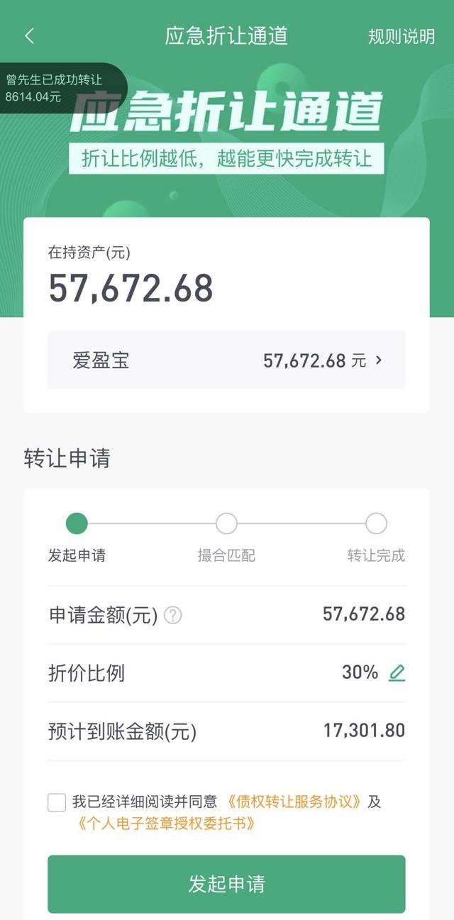 值得一提的是,爱钱进在今年6月份进行了一次紧急维护,推出应急折让通道,折价比例高达30%。即投资人若着急用钱,可以用打折低价出售的方式将自己的出借资金转让,而折让比例越高,就能越快的找到“接盘侠"。而出借人为了进款回笼资金、规避风险,大多数都会选择应急兑付,也就是说,本应按时拿到回款的用户只能通过折让的方式拿回投资。