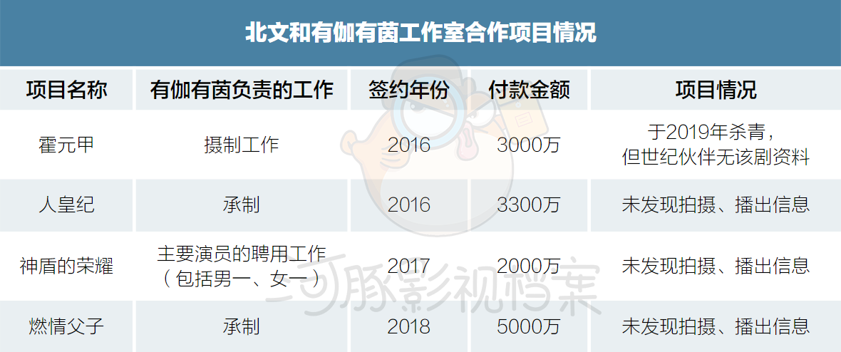 这样的疑惑对于回应披露的世纪伙伴其他项目情况而言,已经不算什么。一家名叫有伽有茵的影视工作室和世纪伙伴的交易才叫扑朔迷离。