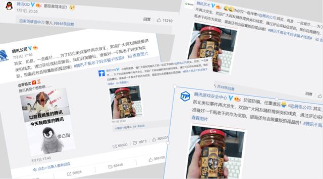 到下午17点56分,腾讯在微博发布第一条回应微博之后,腾讯相关品牌纷纷在微博下方回应,蹭热度博品牌曝光。