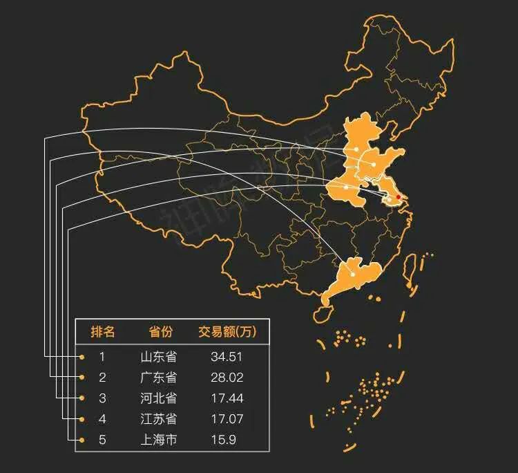 作为普适性需求,一、二线城市的消费者都乐于购买,山东省交易额遥遥领先,其次是广东省、河北省、江苏省及上海市。