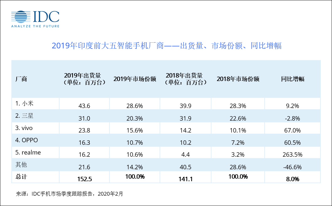 ▲2019年印度出货量前五的手机品牌及市场份额 图/IDC
