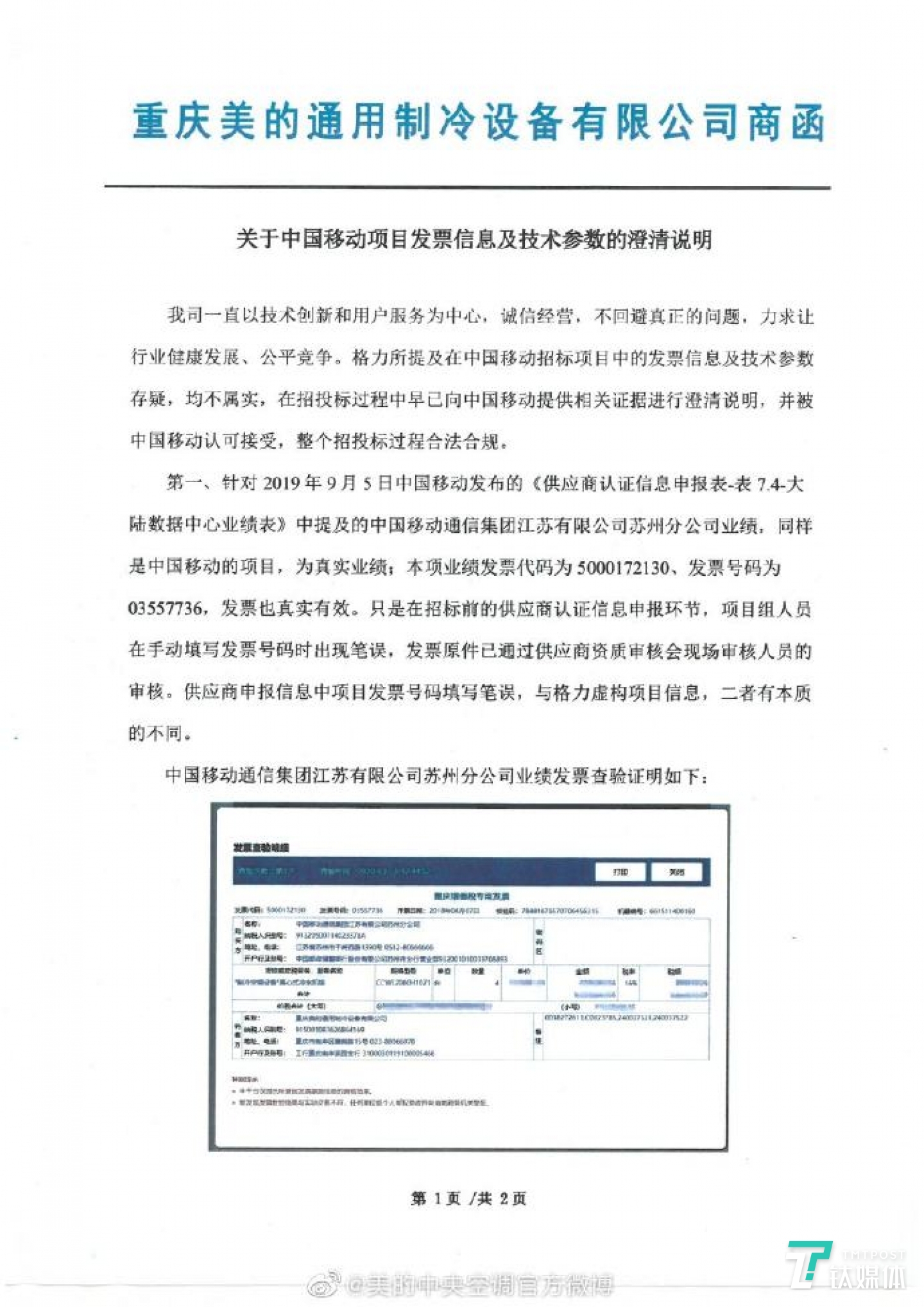 今日,格力在官方微博发布一篇名为《在移动招标项目中,谁在弄虚作假?》的文章,指出美的在中国移动的招标中存在发票信息不一致、技术参数不符合招标标准等弄虚作假和暗箱操作的行为。格力电器称,在企业招投标过程弄虚作假、暗箱操作等违法行为危害中国的营商环境,阻碍中国经济发展。中国移动和格力电器同为社会关注的行业领军企业,有义务为同行和社会作出表率,共同维护良好的营商环竟。