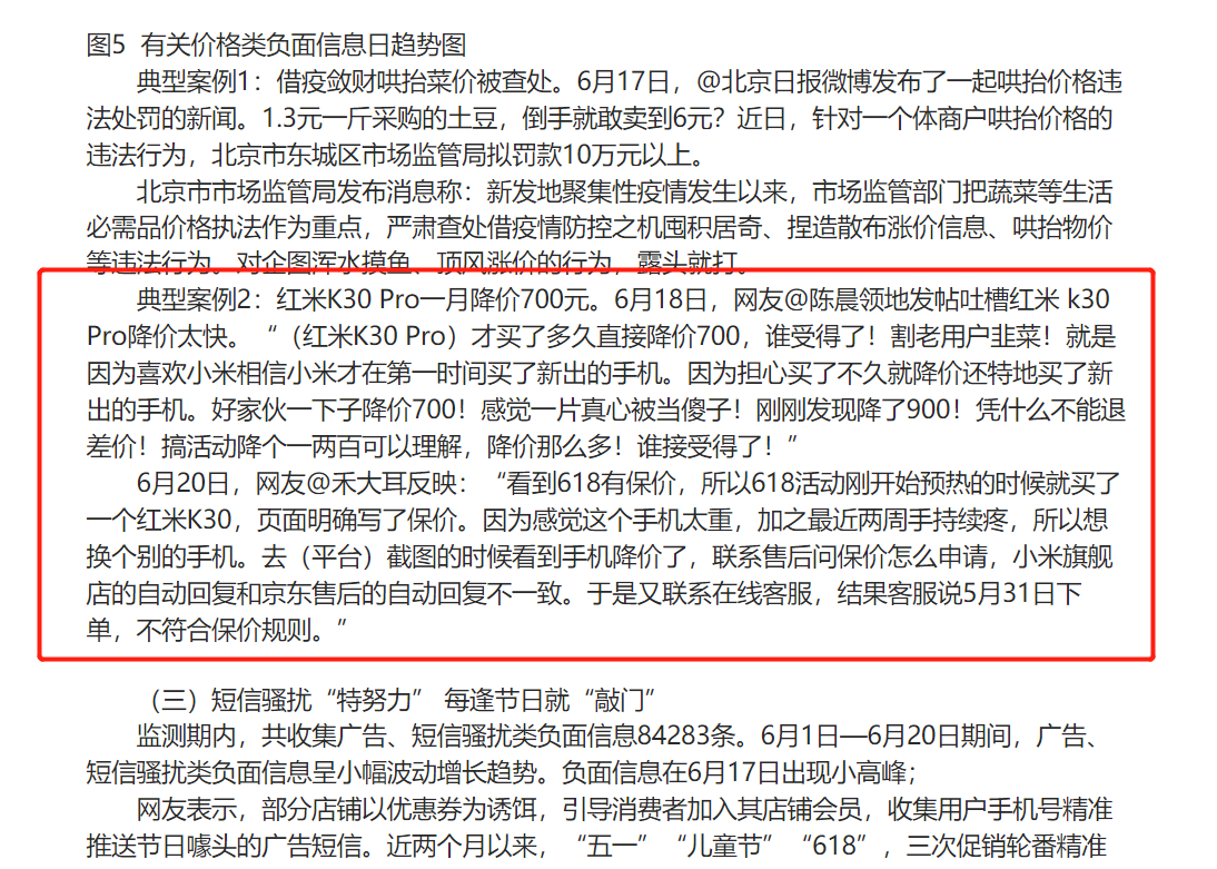 骂骂咧咧的消费者不在少数,更有甚者闹到了中国消费者协会上。中国消费者协会在6月29日发布了《“618”消费维权舆情分析报告》,《报告》中把红米K30 Pro降价700列为了消费者投诉的典型例子,但需要注意的是,中消协并未对此发表观点。