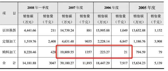 招股书还披露,金凰珠宝2006年在黄金首饰购料加工业务中年销售量为21千克,销售额223万元,而到2007年则飙升至1357千克,1.98亿元。
