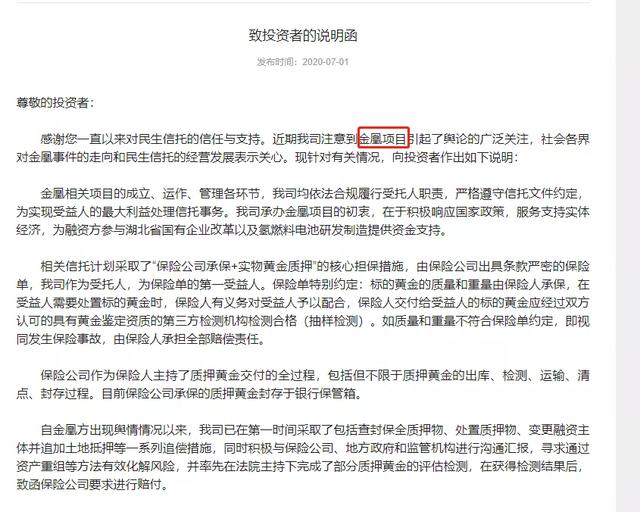 而东莞信托和民生信托则分别在6月30日发布的"致投资者的说明函"中,明确表示正通过法律途径要求保险公司履行对质押黄金的保险责任,维护投资者的合法权益。其中民生信托还提到"目前相关诉讼已取得实质性进展"。