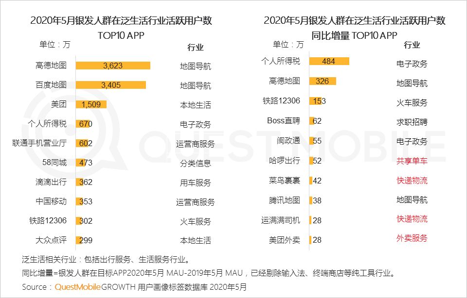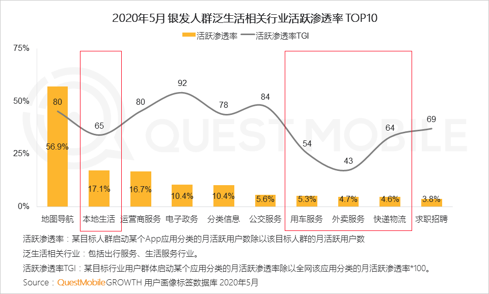 3.1 银发人群对于泛生活应用比例普遍低于全网,本地生活、用车服务、快递物流、外卖服务等由于涉及线下交互,使用门槛较高,使用习惯仍有待进一步培养