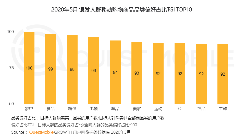 5、从品类上看,家电、食品、电器等标品更能吸引银发人群通过线上购买