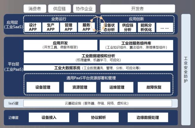 这四个方面分别对应边缘层、IaaS层、工业PaaS层、工业SaaS层以及贯穿上述各层级的安全防护,而其中,边缘层、平台层、应用层是工业互联网平台的三大核心层级。