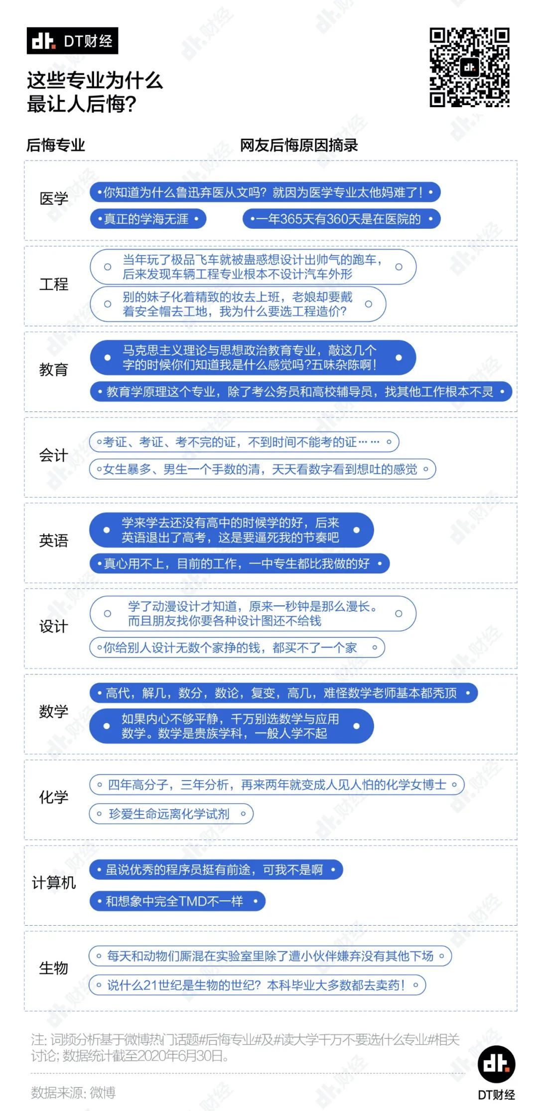 鉴于此,DT君特意扒了扒微博和豆瓣上的相关话题,来看看哪些专业最容易后悔,哪些专业集万千羡慕于一身,却又有着不为人知的真相?