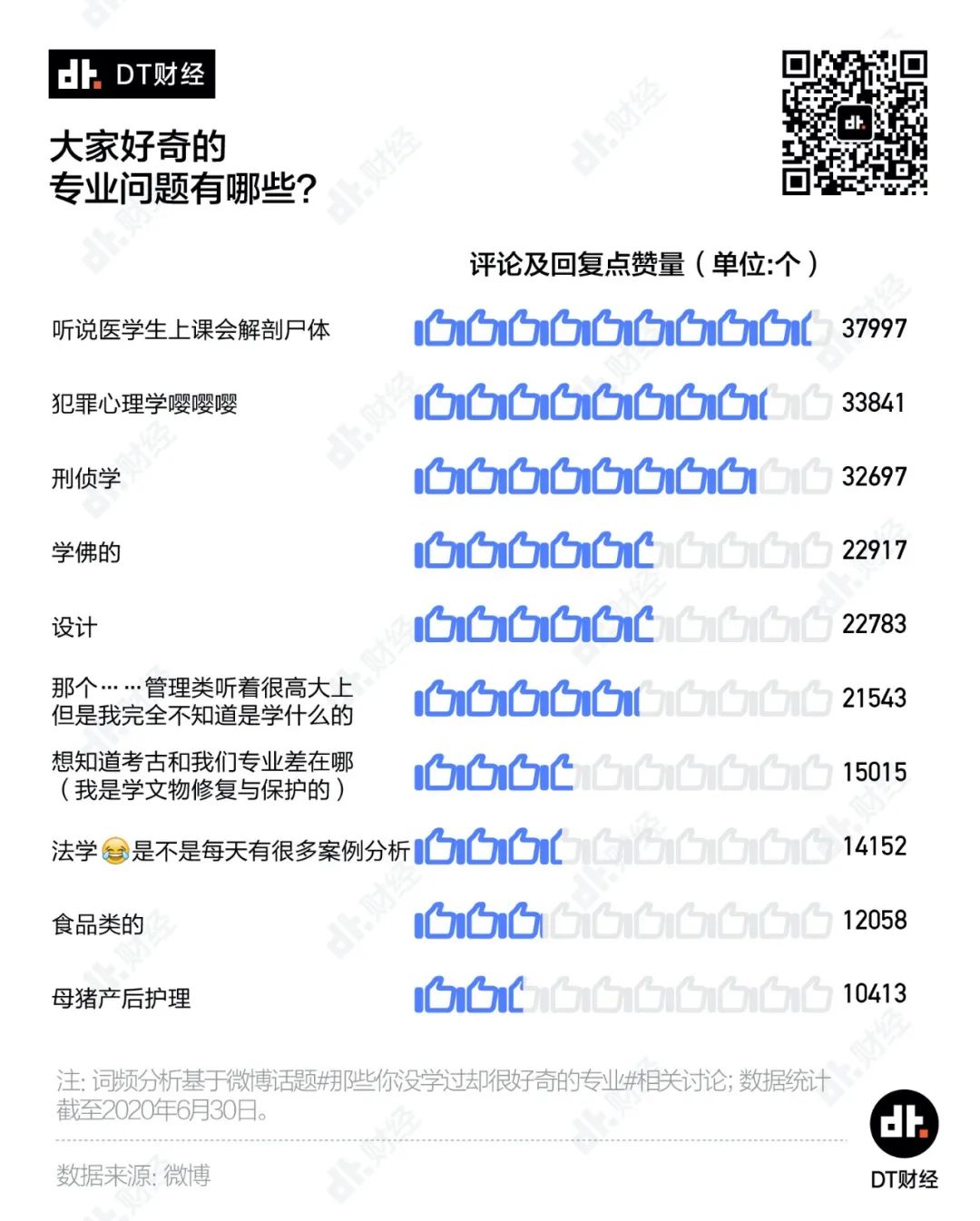所以到底是什么吐槽这么“好玩”,这么让人好奇呢?根据相关评论的热度和回复的点赞量,“医学生上课是否会解剖尸体”、犯罪心理学以及刑侦学成为大家最感兴趣的三大专业话题。