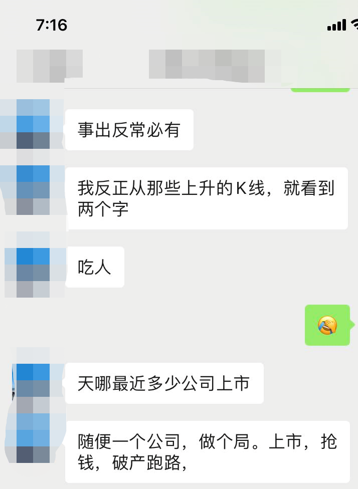 “还是建议大家别炒股了,事出反常必有妖,我反正从那些K线图上就看到两个字——吃人。最近多少公司上市,随便一个公司,做个局,上市,抢钱,破产,跑路。”