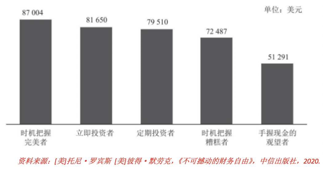 嘉信理财金融研究中心曾做过一个研究,假定5位投资者每年拿出2000美元购买指数,其中,有位投资者每年都选择了最佳买入点(最低点买入),有位投资者每次都是最糟糕买点(最高点买入),20年之后,二者的盈利差距不到1.5万美元。见下图。
