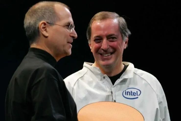 更换芯片的工程量极其巨大,相当于需要重写整套操作系统,因此直到2005年,苹果和英特尔才就合作发表了声明。那一年,应邀出席苹果百杰集思会的英特尔CEO保罗·欧德宁,身着兔子装一样的实验室外套,将怀中的硅片交给乔布斯,两位硅谷传奇人物历史性的拥抱在了一起。
