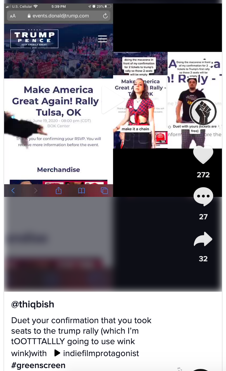比如,在塔尔萨集会前,不少人发布的TikTok视频都使用了同样的舞蹈和文字,用类似的拍拍肩膀、扭动几下的舞蹈和“赶紧为特朗普的竞选活动定两张空票”的配文来支持“狙击”特朗普的活动。