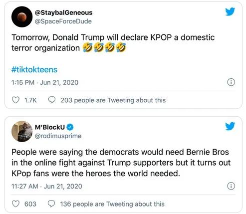韩流粉丝Ria在接受外媒采访时说,她计划参与更多的类似“狙击”特朗普的政治活动,并认为很多K-pop的粉丝也是这么想的。“在作为一个粉丝之前,我们首先是一个关心政治的年轻人,如果我们拥有TikTok这样的平台,那么我们会试着做更多。”