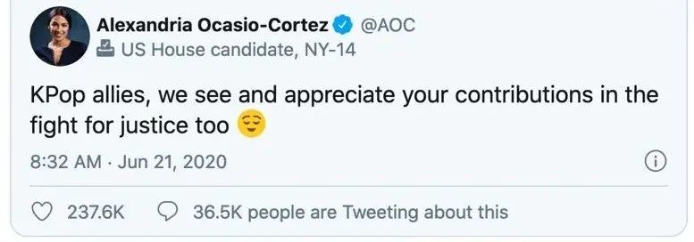 据CNN报道,在TikTok上,有一个观看次数超过30万次的“虚假预约”视频,就来自BTS的粉丝。塔尔萨集会后,民主党众议员亚历山大·奥卡西奥·科尔特斯也发推表示:“韩流朋友,感谢你们‘为正义而战’。”