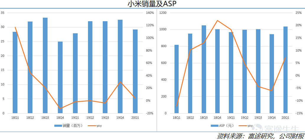 2020Q1在全球手机市场受疫情冲击整体下滑的情况下,小米却实现量价齐涨、逆势增长。出货量方面,小米在全球五大厂商中同比增速最快,是五大手机厂商中仅有的两家维持出货量同比增长的厂商。而且由于5G高端机型的带动,小米2020Q1ASP持续提升,同比增长7%达到1038元。
